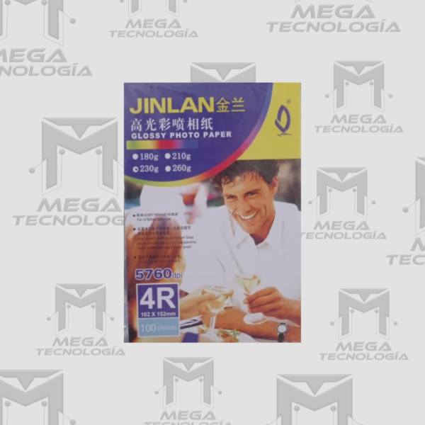 El Papel Fotográfico Jumbo 10×15 cm 230 g es ideal para impresiones de alta calidad en impresoras de inyección de tinta. Ofrece acabado brillante, secado rápido y viene en un paquete de 100 hojas.