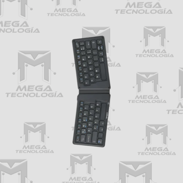 Teclado Targus AKF003ES plegable, inalámbrico y multipunto, diseñado para conectarse vía Bluetooth 5.0 a hasta tres dispositivos simultáneamente. Cuenta con diseño QWERTY en español, retroiluminación LED ajustable, resistencia a salpicaduras y recubrimiento antimicrobiano. Compatible con iOS, Android y Windows. Dimensiones plegado: 28.3 × 11.7 × 2 cm; desplegado: 28.3 × 23.6 × 0.8 cm; peso: 450 g. Batería recargable vía USB-C con duración de hasta 30 horas por carga.